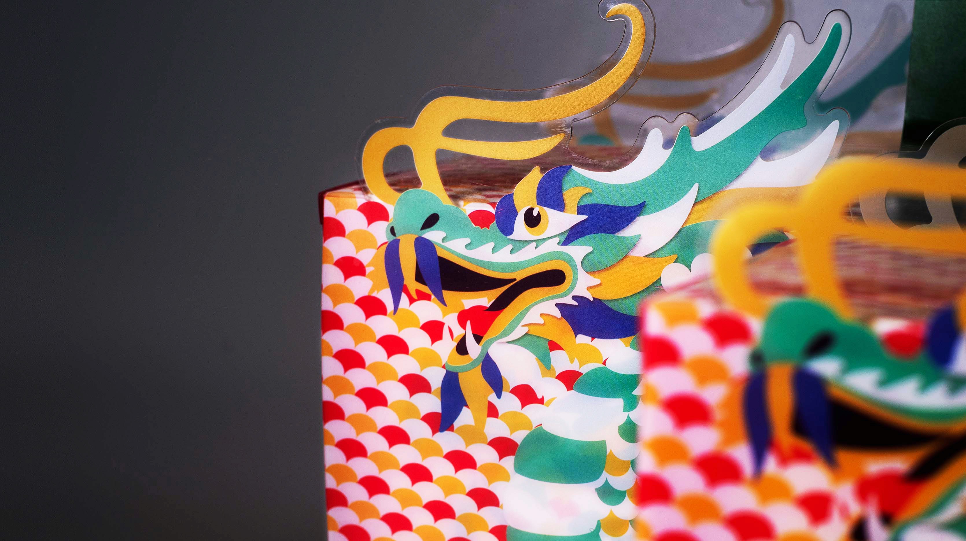用波点艺术解构端午龙纹视觉,通过高饱和撞色与几何切割重塑传统视觉符号。