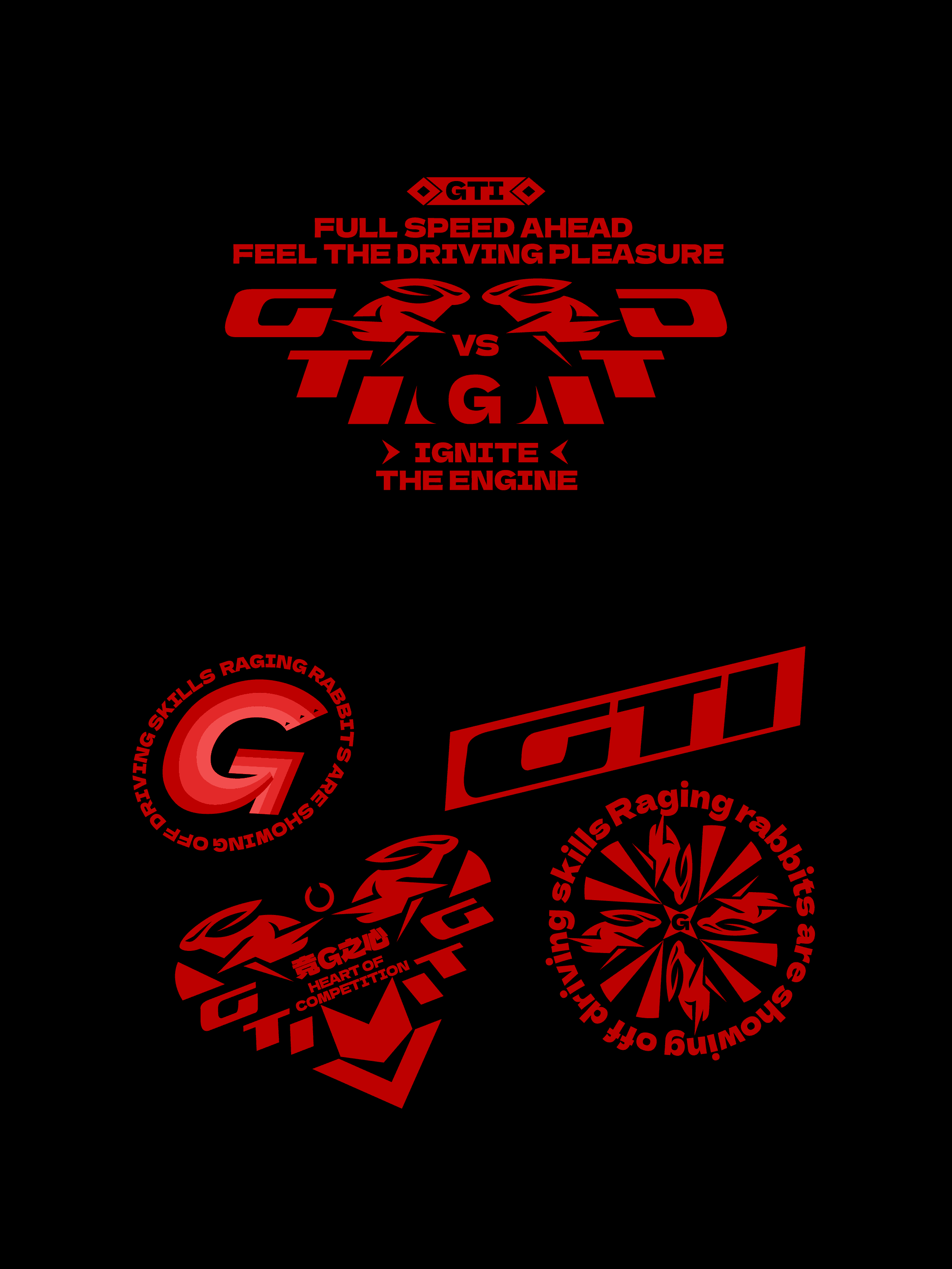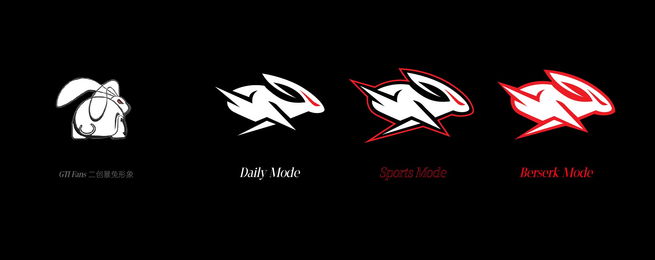 我们在设计时,选择从那一刻的速度爆发出发—— 兔子的极速奔跑姿态 → 捕捉前后腿交错的力量感;融合“闪电”元素 → 象征GTI的爆发与速度; 红色眼部线条 → 呼应GTI标志性的红色大灯,传递“暴烈”的精神。